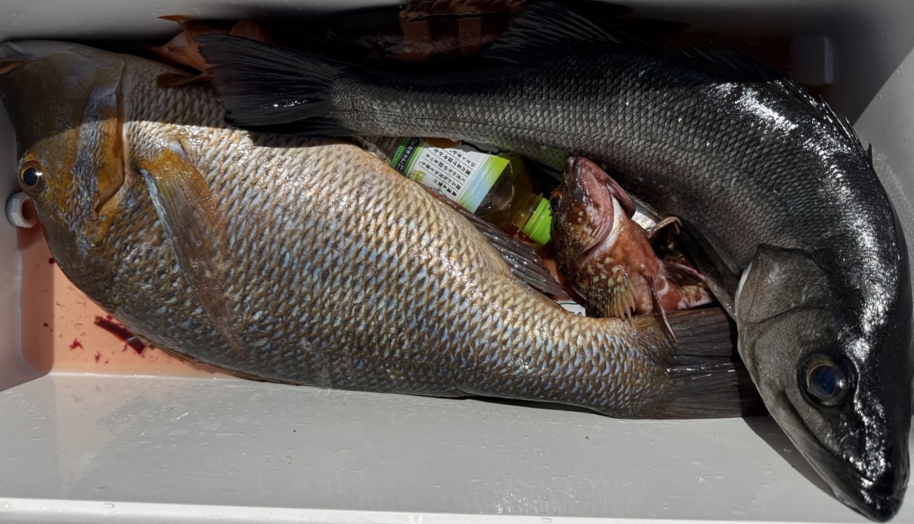 磯釣り 本日磯釣り釣果🎣 グレ、イサキ、石鯛、ヒラスズキ、タマン、アカハタ、ホゴ🐟 朝はうねり有り。 沖磯は風波だけでした。 明日はいい天気になりそうです☀️ 時化の中でも安全第一で磯おろしました〜 水温18.1℃