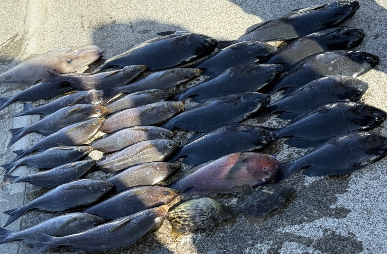本日磯釣り釣果🎣 グレ、イサキ、イシダイ、オオモンハタ、アカハタ、マルハゲ🐟 なぜか平日より少ない状況でした笑 嬉しそうに乗ってくる顔はイイね‼︎🤭 明日も磯釣り出船予定です🗓️